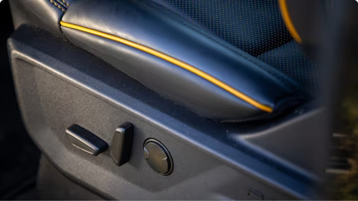 En el interior se pueden ver detalles en color naranja cobre como las costuras y los emblemas, enfatizando su espíritu dinámico.